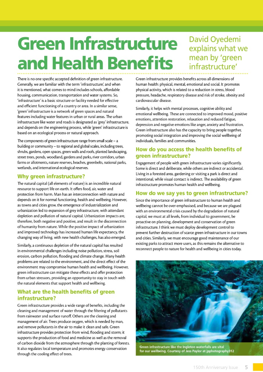 Since the importance of green infrastructure to human health and well-being cannot be over-emphasised, and because we are plagued with an environmental crisis caused by the degradation of natural capital. We must at all levels, from individual to government, be proactive on planning, development and conservation of green infrastructure.